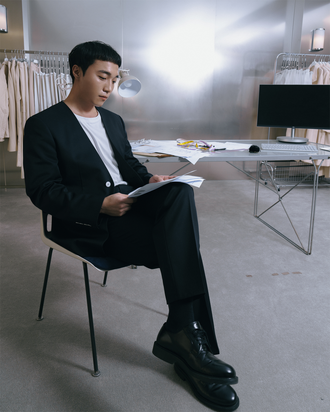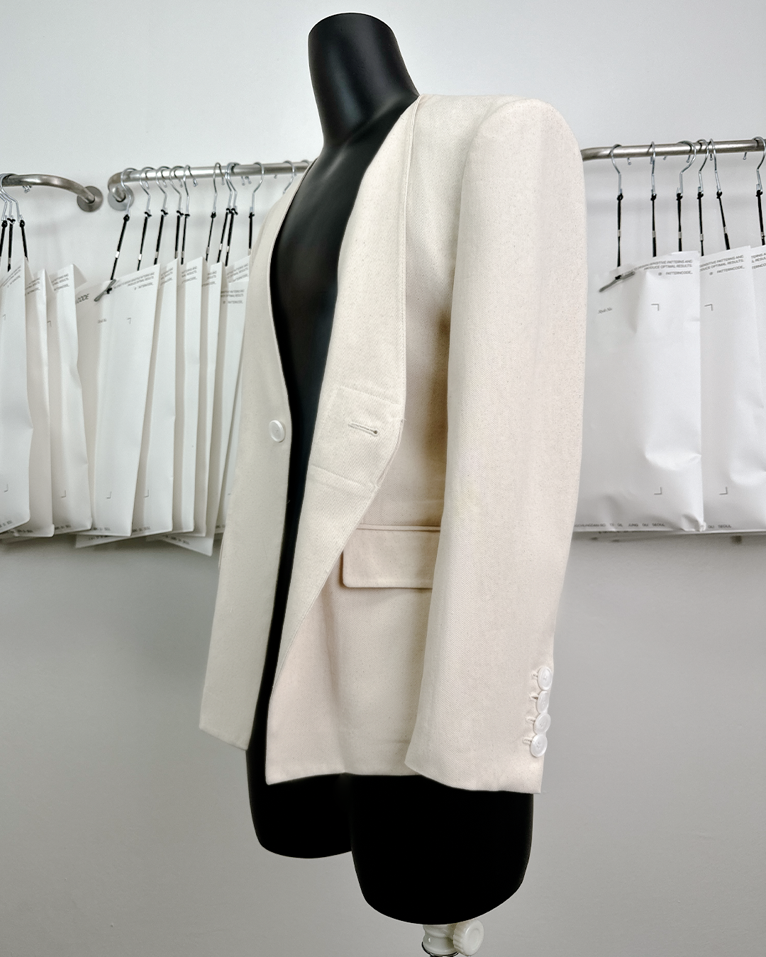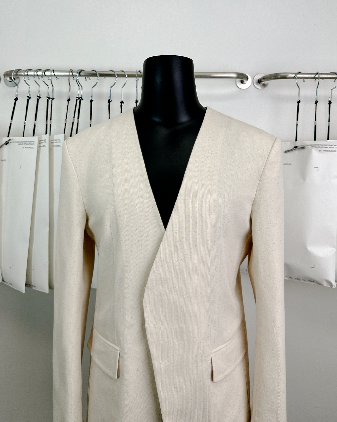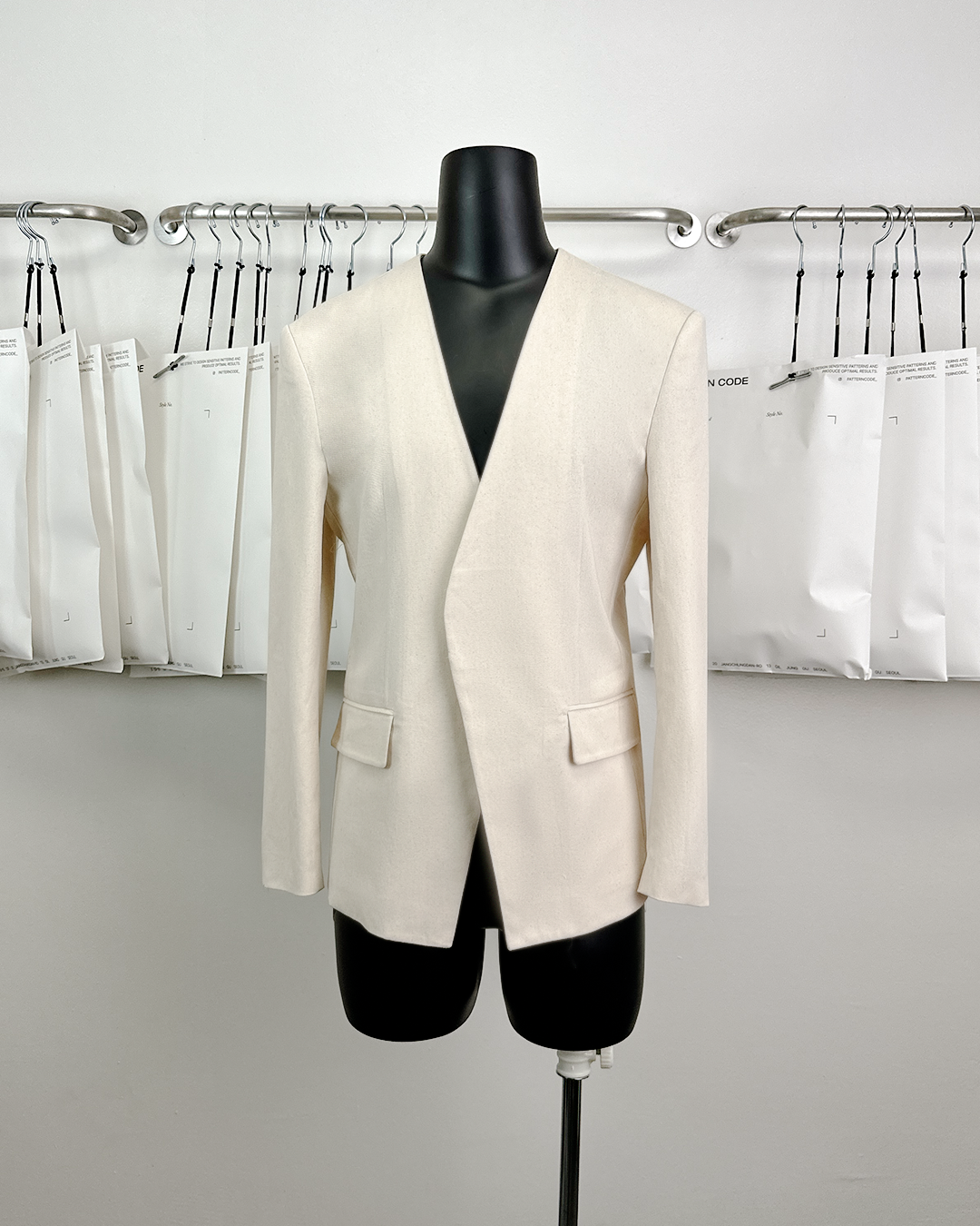 · 칼라와 라펠을 생략한 미니멀한 디자인