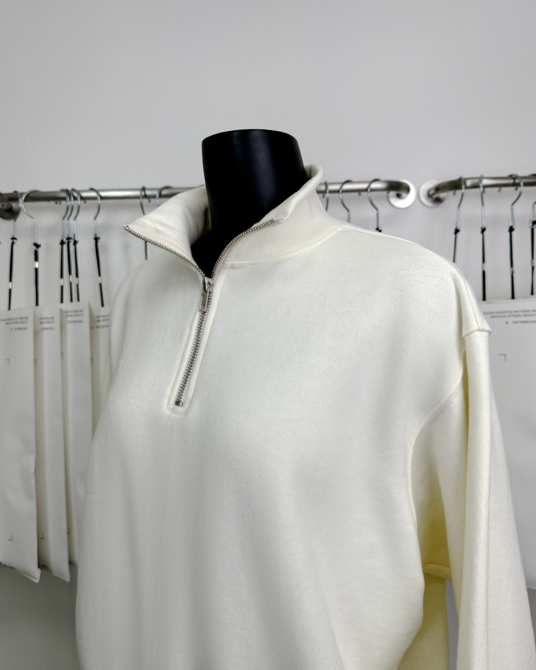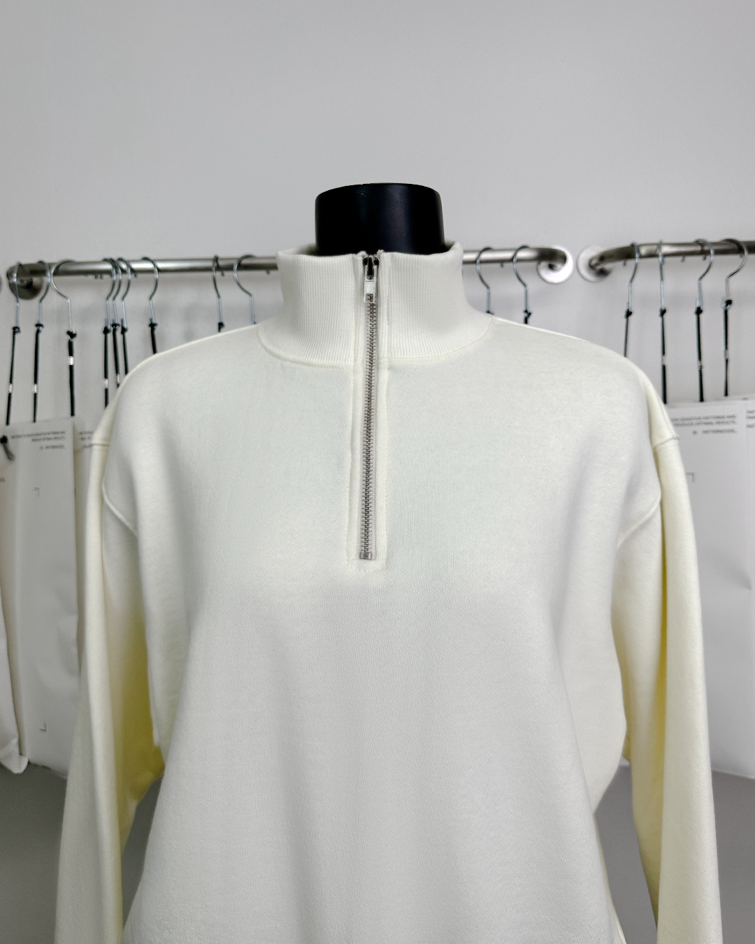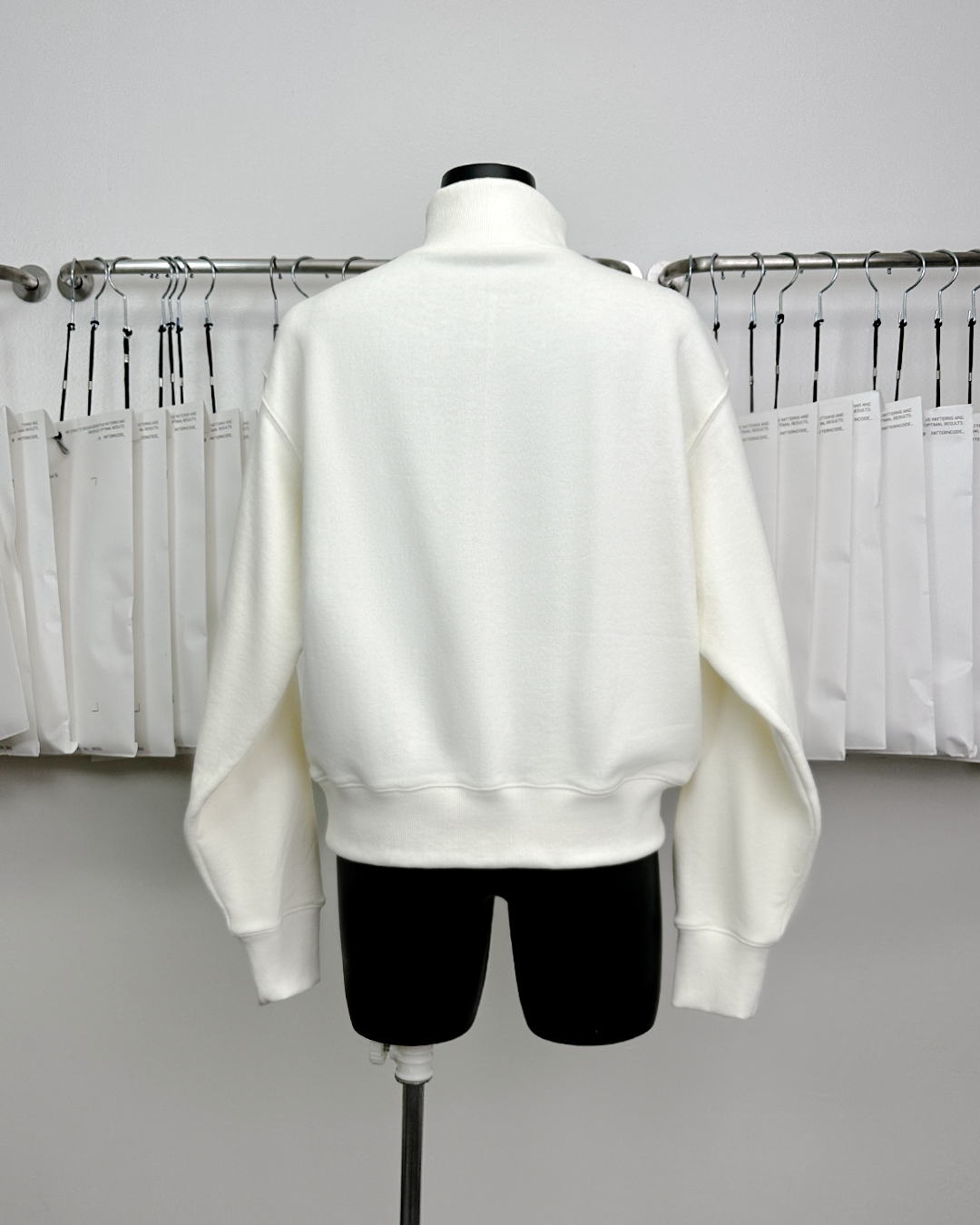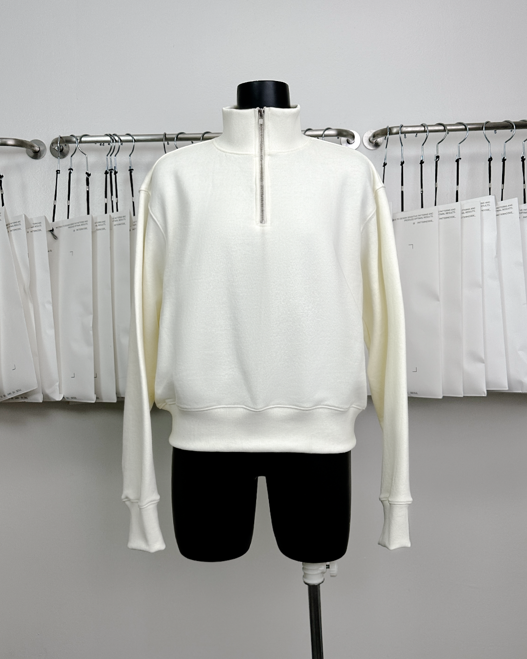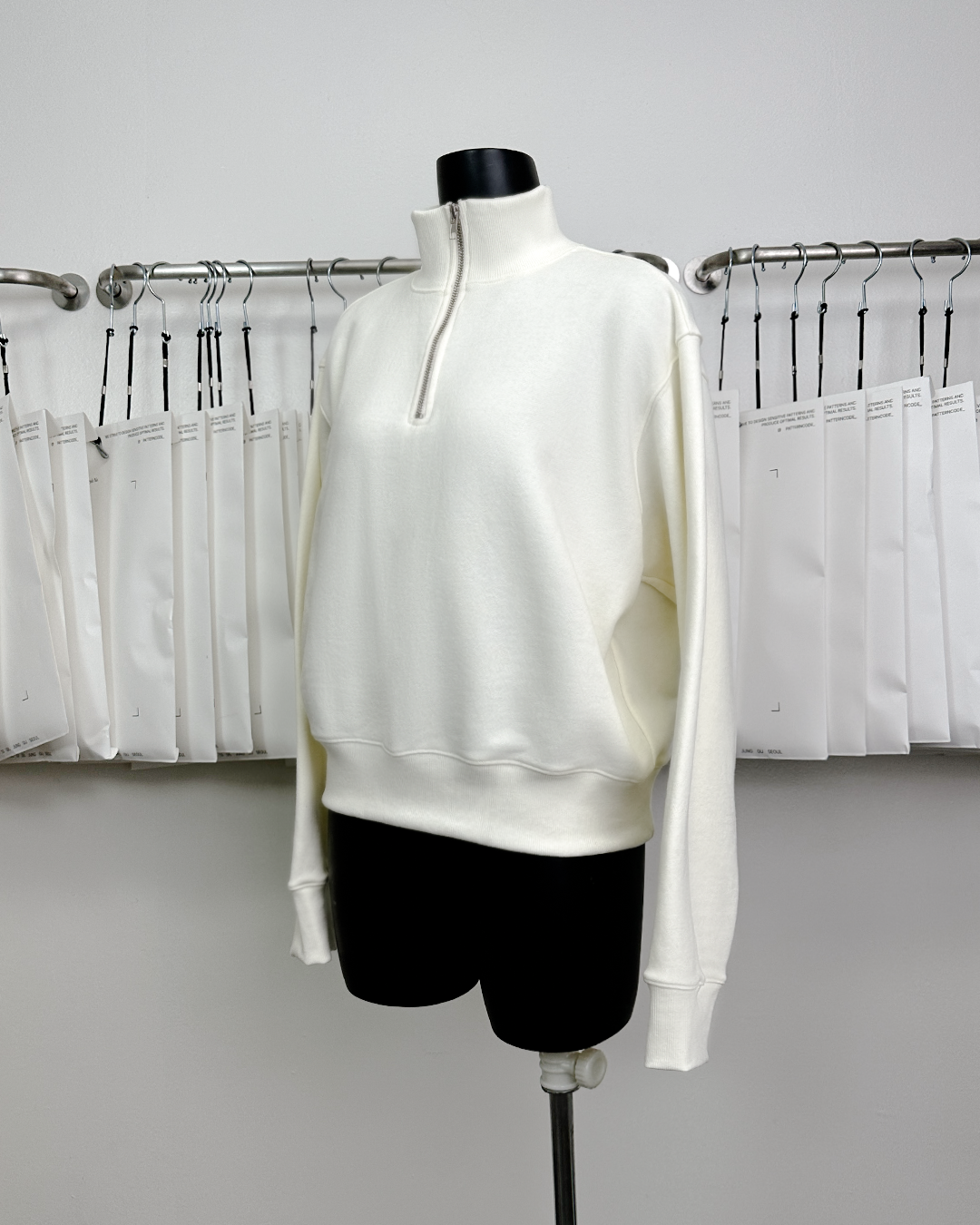 · 넥을 감싸는 립 디테일의 하프 집업 스웨트 셔츠입니다.