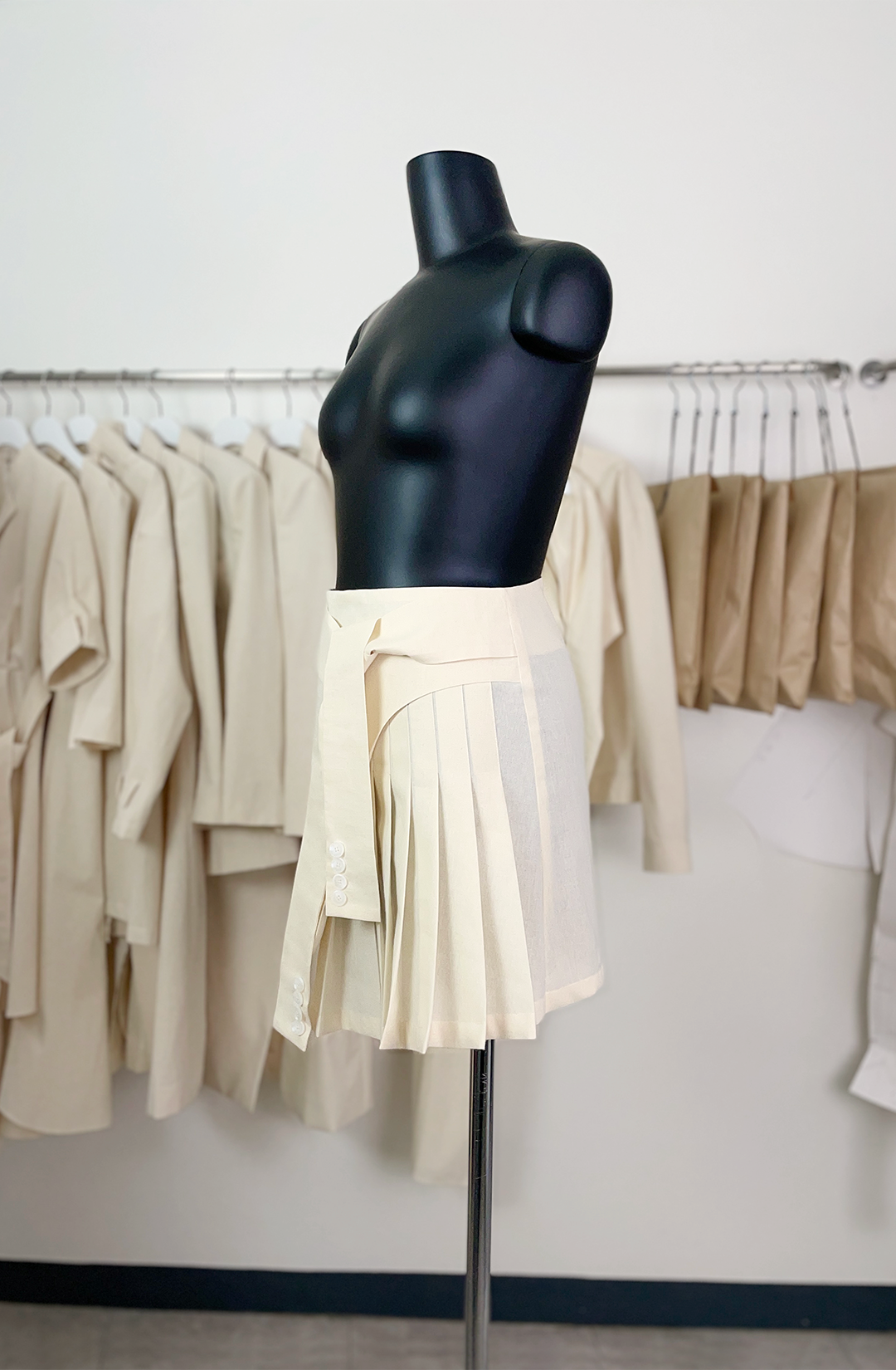 · 곡선으로 컷팅된 블레이저의 밑단 라인과 소매 디테일을 적용하여 디자인된 랩 형식의 플리츠 스커트입니다.