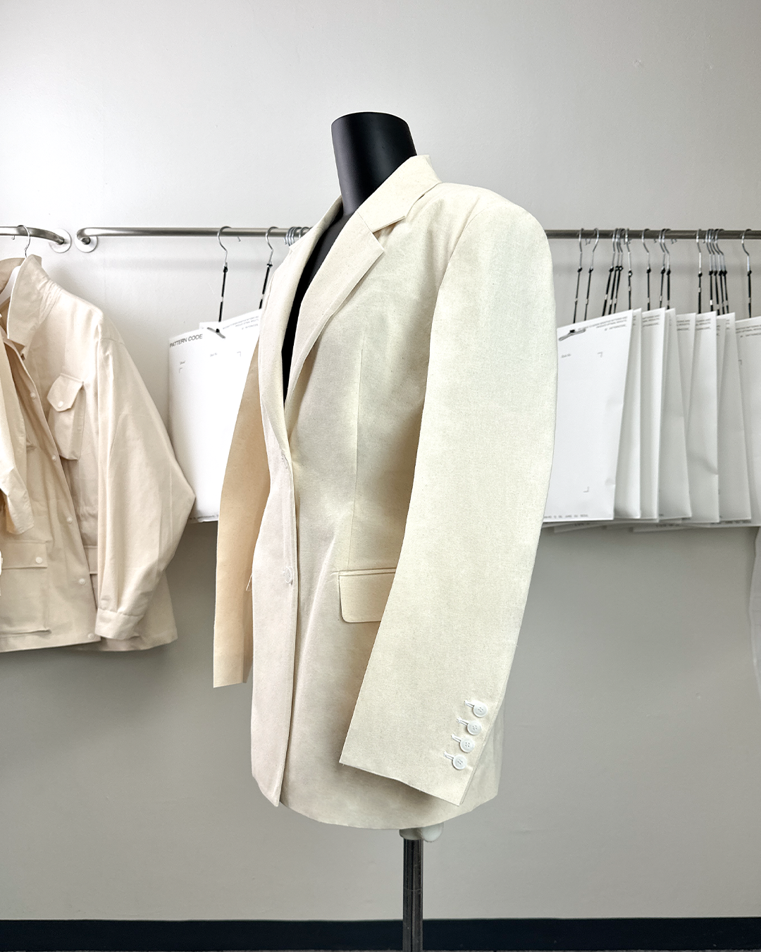 · 잘록한 허리 라인과 대비되는 아워 글라스 실루엣의 블레이저입니다.